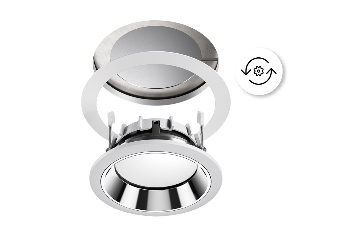 Amatris is the recessed luminaire of choice not only for new buildings but also in refurbishment projects: multilumen technology is used to easily adjust the luminous flux when installing luminaires in existing buildings. Special accessory refurbishment plates also adapt the downlights to existing openings.