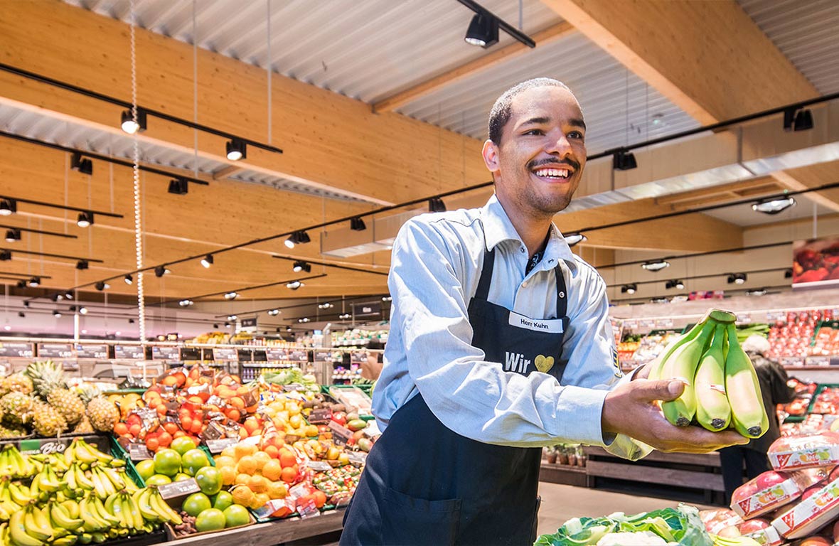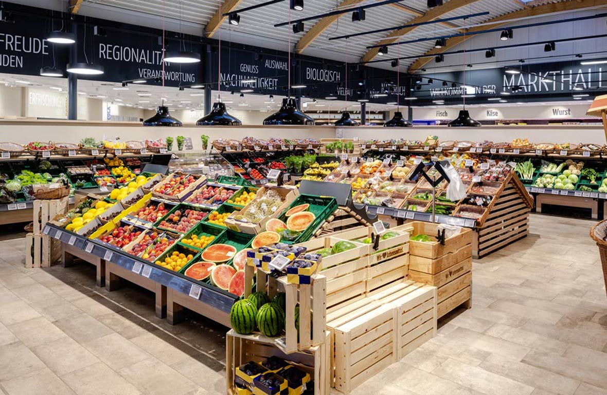 Fruit, wine, drugstore goods – each product group in the food trade places specific demands on lighting. With our customised solution portfolio, all areas can be perfectly illuminated, from the fresh food counter to the product aisle and cash register area to the car park. The result: bright, crisp colours, a relaxed shopping experience and satisfied customers.