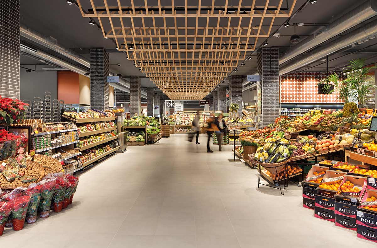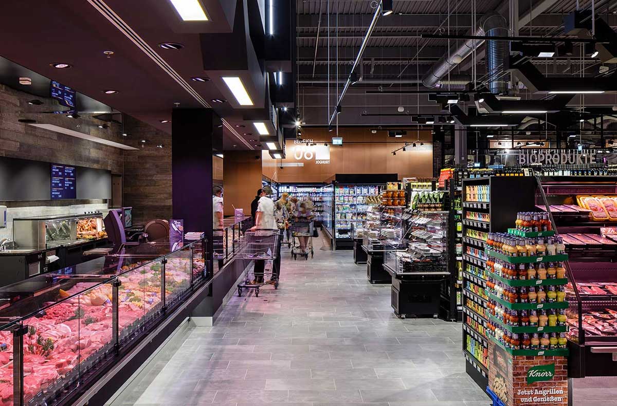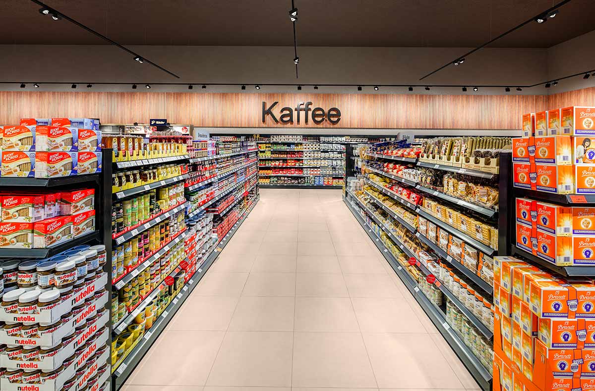 A large number of products and brands fill the shelves of merchandise aisles. Rear walls have a strong long-distance effect both as spatial boundaries and as carriers of information. Oval free-form lenses ensure uniform and three-dimensional illumination of vertical surfaces and allow a quick general overview.