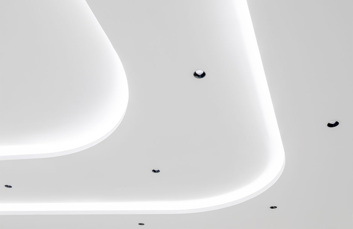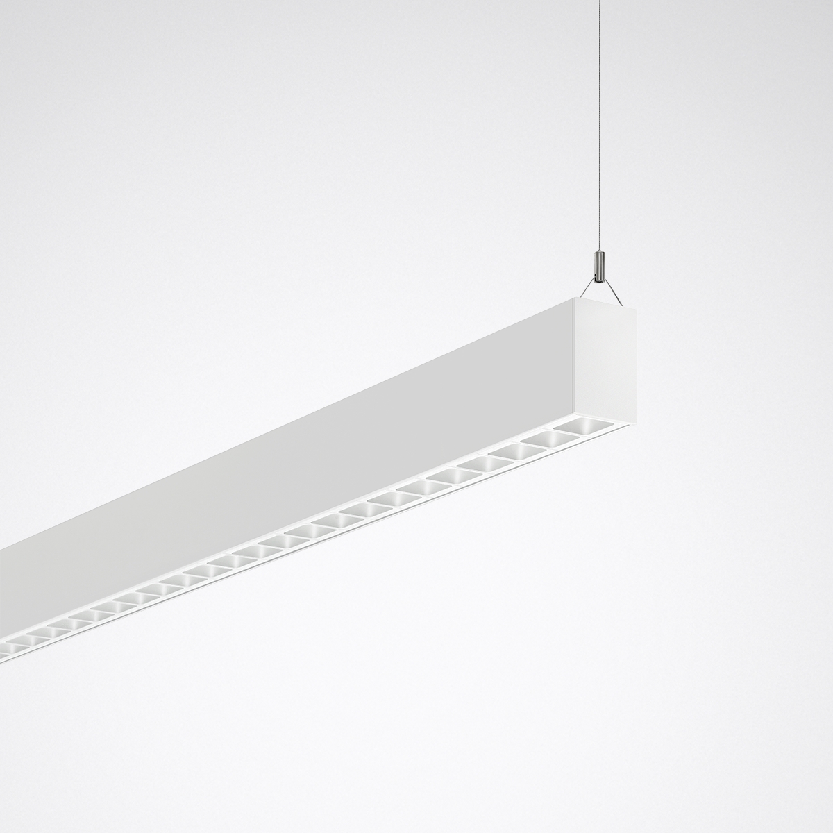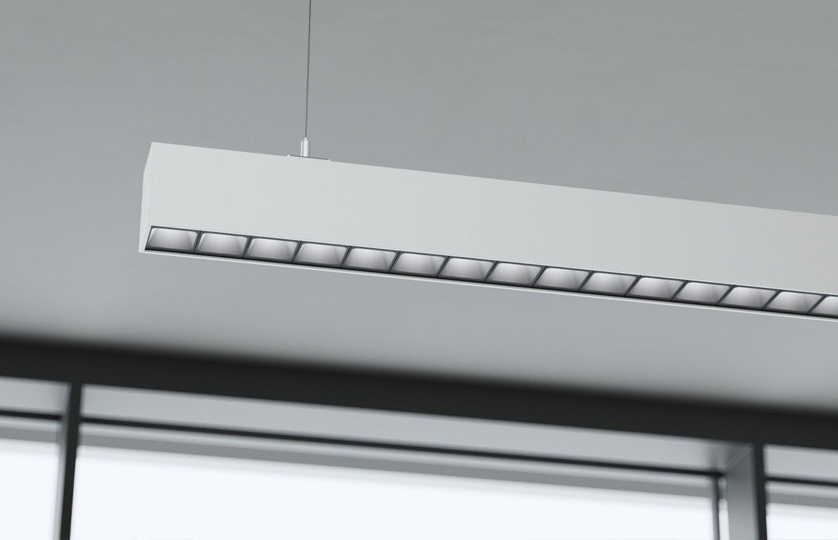 It does not cause glare, and low luminance levels and gentle contrasts at the light emission surface allow the origin of the light to be surmised. The luminaires have a calm and discreet effect. It enables nuanced lighting concepts through various light distributions from a uniform design. This is a principle that works just as well with linear luminaires as with downlights or spotlights.
