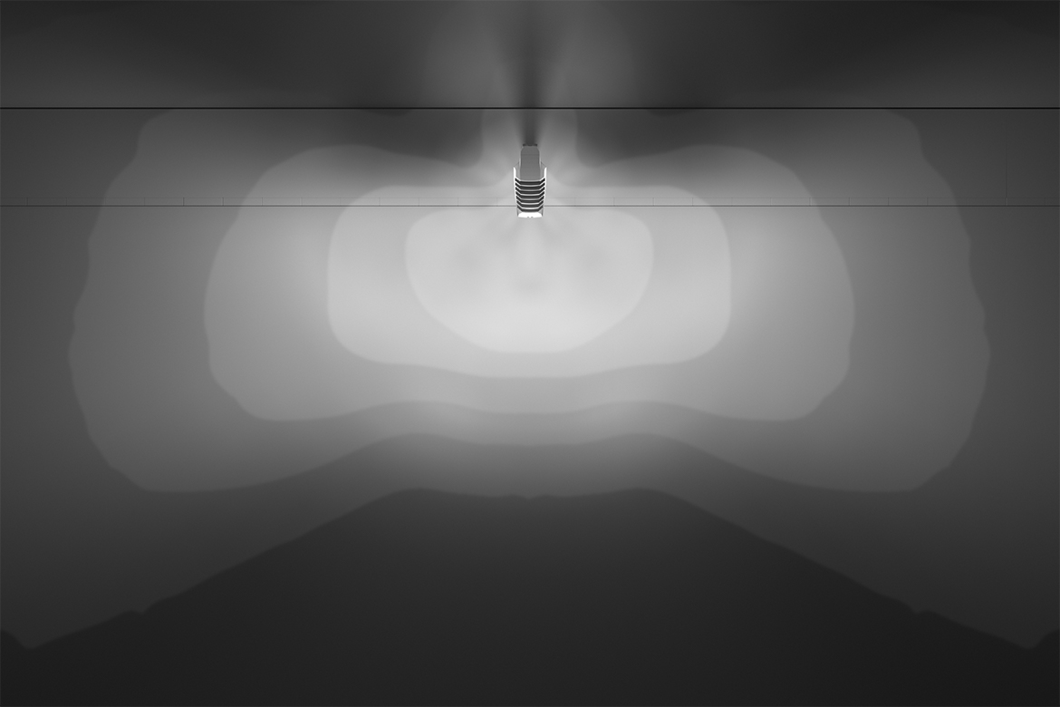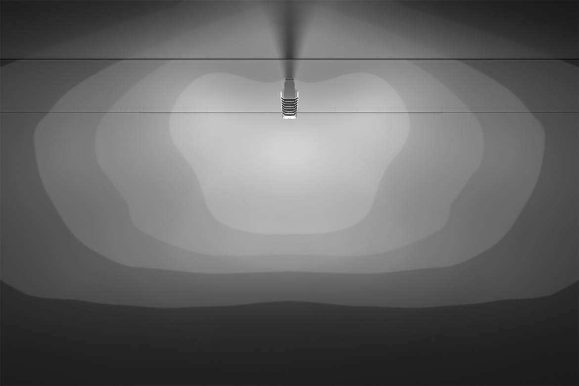 Asymmetric wide distribution for road lighting according to M1 and M2 lighting classes with a road width-to-light point ratio of 0.6 to 1.1.